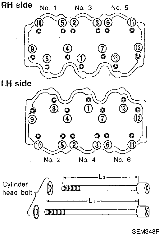 Note: Cylinder head bolts for 4, 7, 9 and 12 are longer than the others.