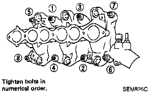 14. Tighten intake manifold bolts and nuts to 8 to 10 Nm (0.8 to 1.0 kg-m, 5.8 to 7 ft. lbs.).