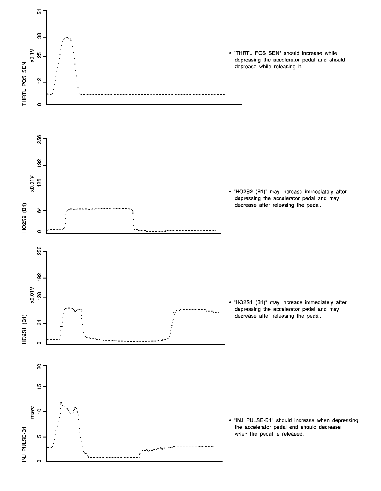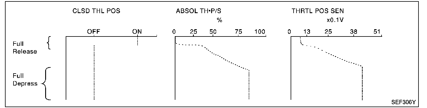 Above is the data for "THRTL POS SEN", "ABSOL TH P/S" and "CLSD THL POS" when depressing the accelerator pedal with the ignition switch ON