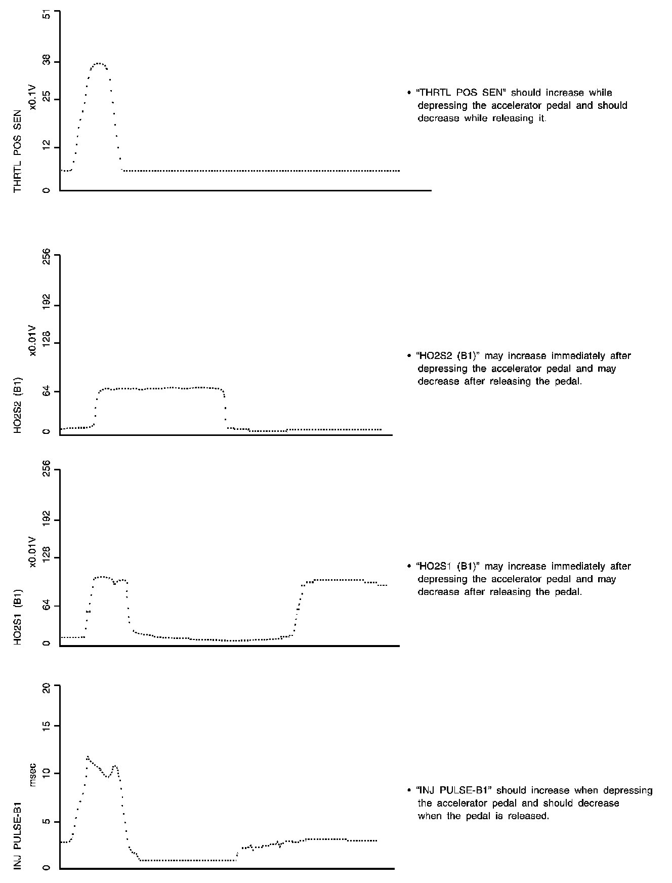 Above is the data for "ENG SPEED", "MAS A/F SE-B1", "THRTL POS SEN", "HO2S2 (B1)", "HO2S1 (B1)" and "INJ PULSE-B1" when revving engine quickly up to 4,800 rpm under no load after warming up engine sufficiently.