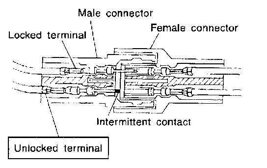 Check for unlocked terminals by pulling wire at the end of connector. An unlocked terminal may create intermittent signals in the circuit.