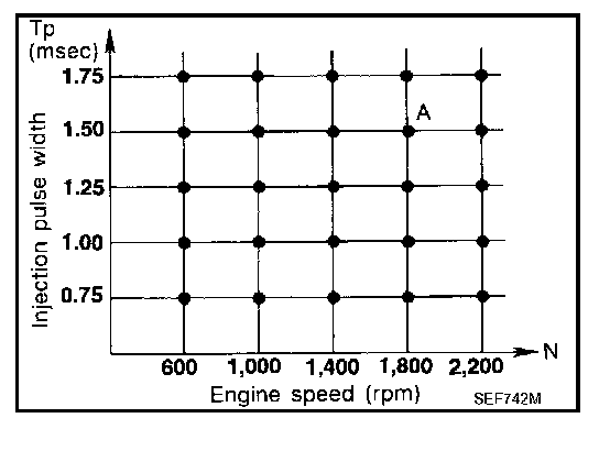 The ignition timing is controlled by the ECM to maintain the best air-fuel ratio for every running condition of the engine. The ignition timing data is stored in the ECM. This data forms the map shown.