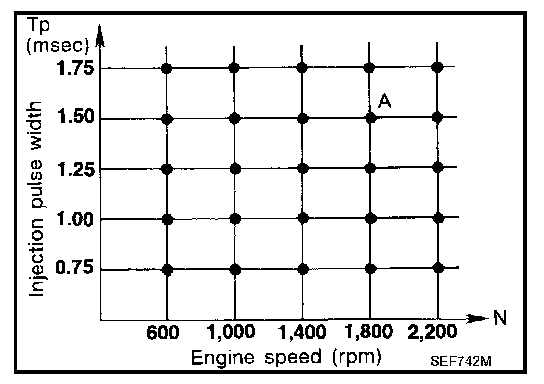 The ignition timing is controlled by the ECM to maintain the best air-fuel ratio for every running condition of the engine. The ignition timing data is stored in the ECM. This data forms the map shown. The ECM receives information such as the injection pulse width and camshaft position sensor signal. Computing this information, ignition signals are transmitted to the power transistor.