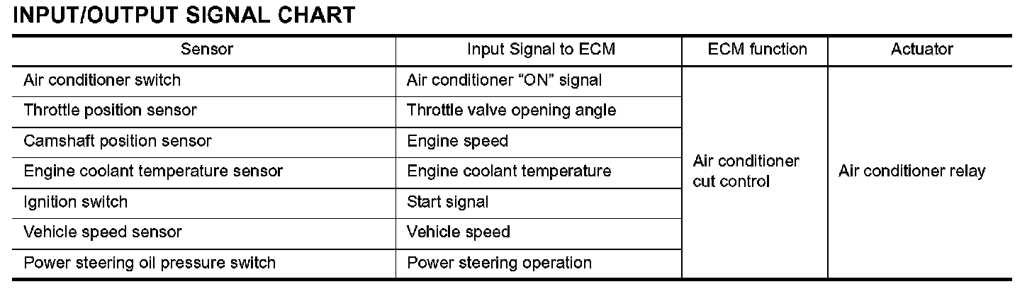 This system improves engine operation when the air conditioner is used. Under the following conditions, the air conditioner is turned OFF.