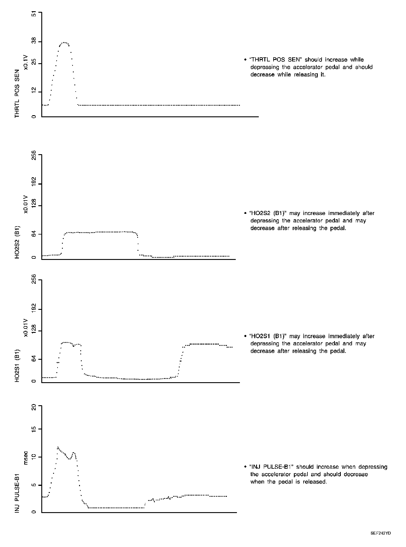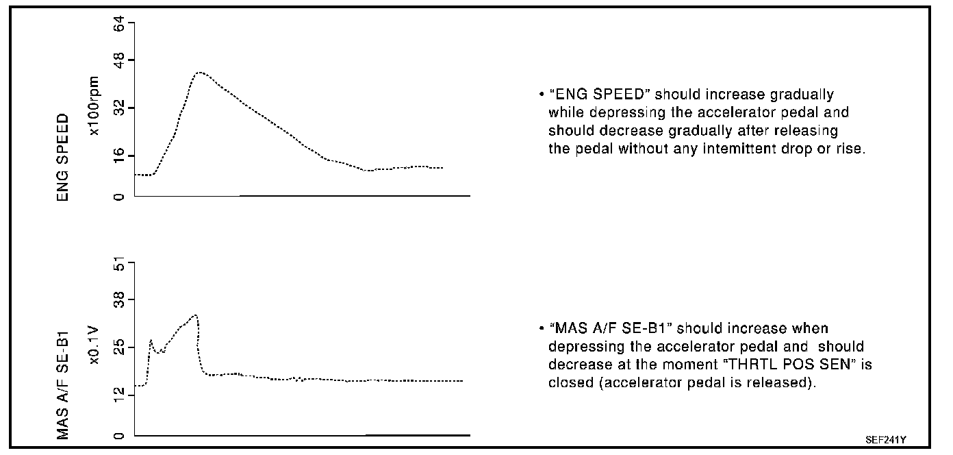 The following are the major sensor reference graphs in "DATA MONITOR" mode. (Select "MANU TRIG" in "DATA MONITOR" with CONSULT-II. "Trigger Point" is set to 100%, "Recording Speed" is set to MAX..)THRTL POS SEN, ABSOL TH.P/S, CLSD THL P05