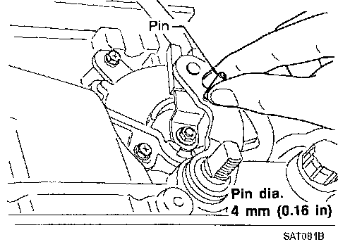 4. Insert pin into adjustment holes in both PNP switch and manual shaft of A/T assembly as near vertical as possible. Reinstall any part removed. Check continuity of PNP switch.
