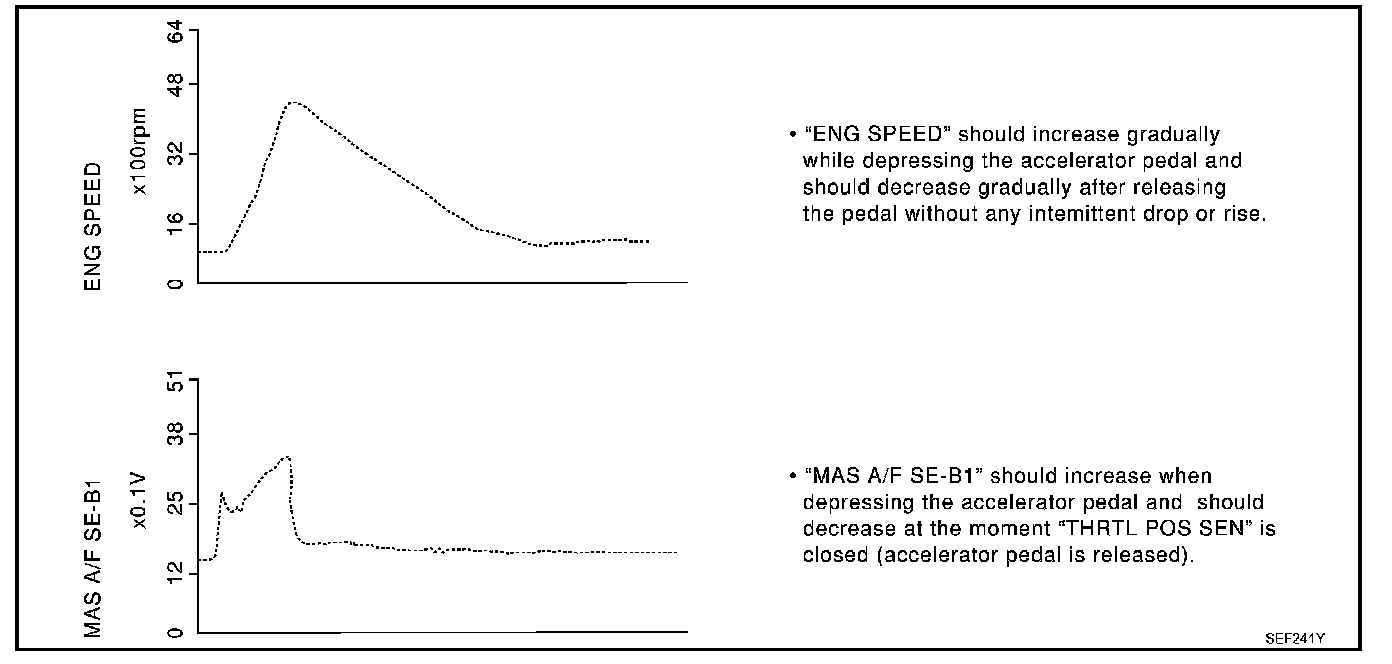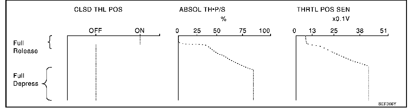 The signal of "THRTL POS SEN" and "ABSOL TH�P/S" should rise gradually without any intermittent drop or rise after "CLSD THL POS" is changed from "ON" to "OFF".L