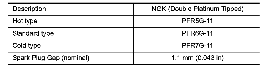Spark plug (Double Platinum-tipped) Gap (Nominal) 1.1 mm (0.043 inch)