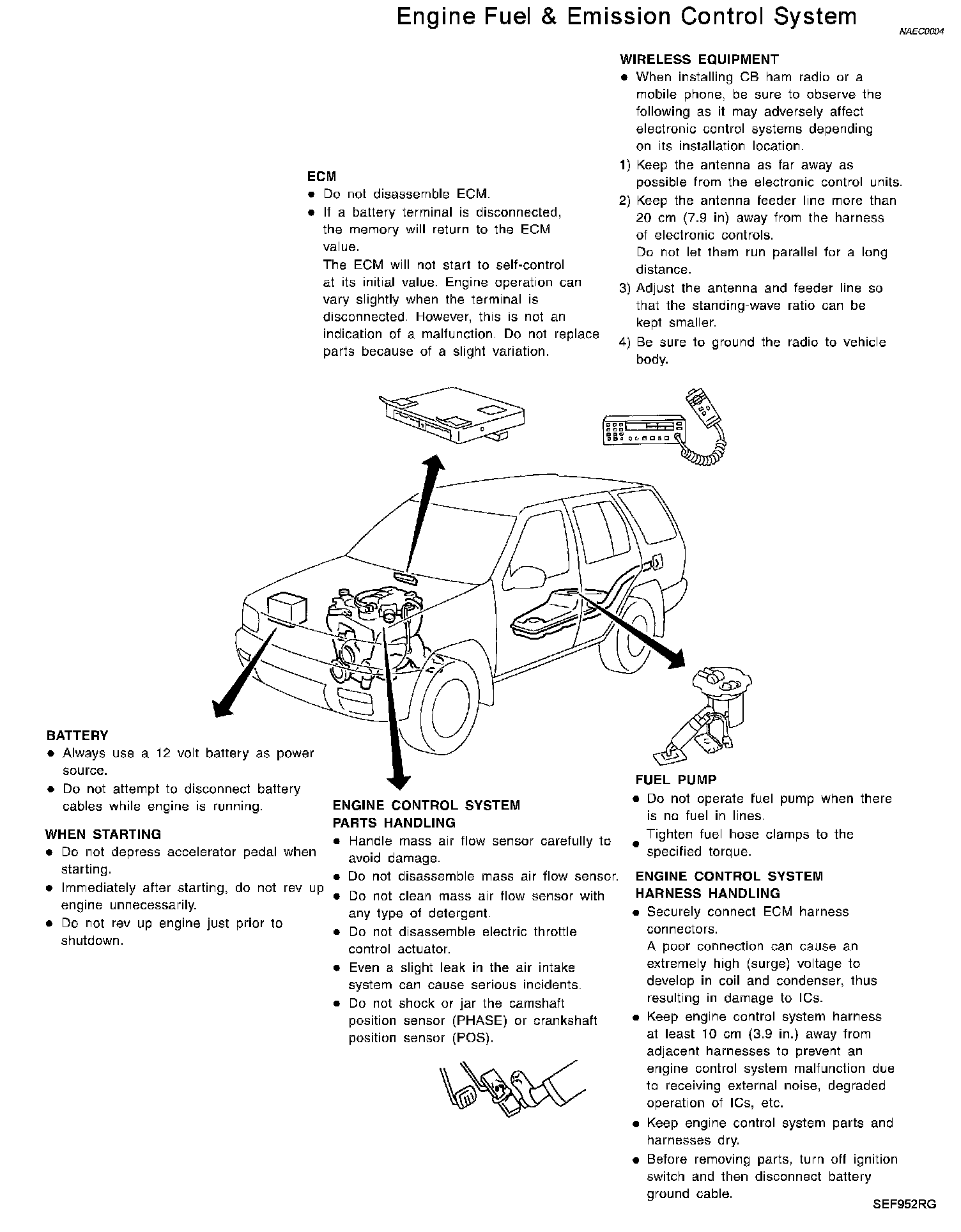 - Be sure to turn the ignition switch OFF and disconnect the negative battery terminal before any repair or inspection work. The open/short circuit of related switches, sensors, solenoid valves, etc. will cause the MIL to light up.