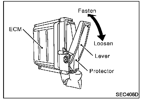 - When connecting ECM harness connector, fasten it securely with a lever as far as it will go.