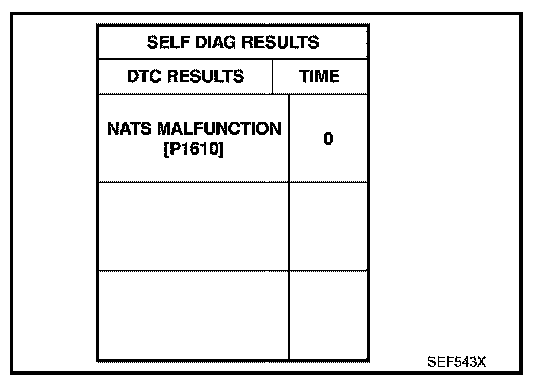 - If the security indicator lights up with the ignition switch in the ON position or "NATS MALFUNCTION" is displayed on "SELF-DIAG RESULTS" screen, perform self-diagnostic results mode with CONSULT-II using NATS program card.