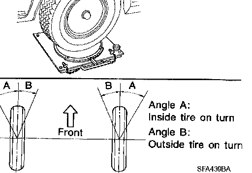 2. Rotate steering wheel all the way right and left; measure the turning angles "A" and "B" as shown.