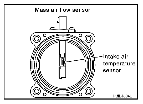 The mass air flow sensor is placed in the stream of intake air. It measures the intake flow rate by measuring a part of the entire intake flow. It consists of a hot film that is supplied with electric current from the ECM. The temperature of the hot film is controlled by the ECM a certain amount. The heat generated by the hot film is reduced as the intake air flows around it. The more air, the greater the heat loss. Therefore, the ECM must supply more electric current to maintain the temperature of the hot film as air flow increases. The ECM detects the air flow by means of this current change.
