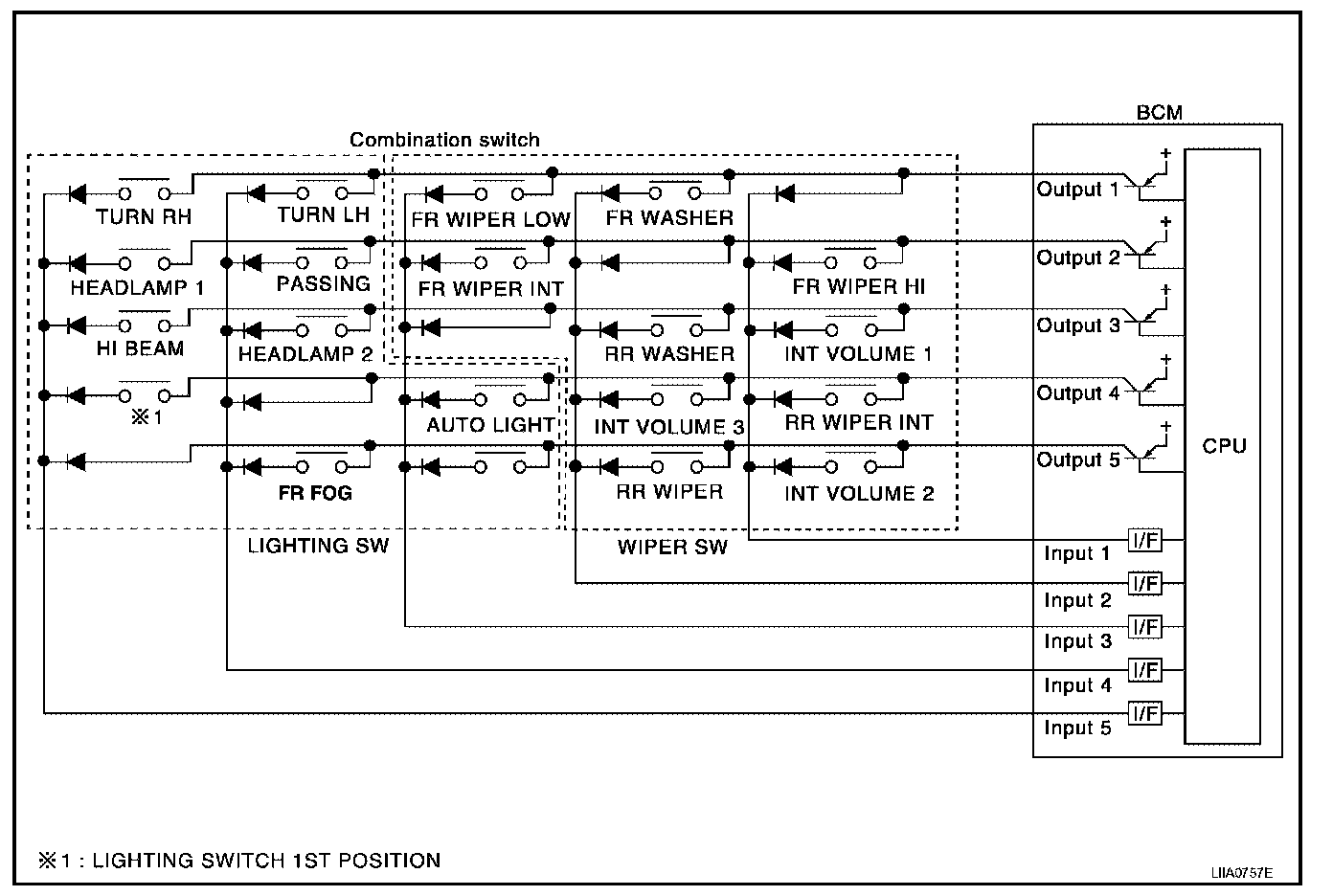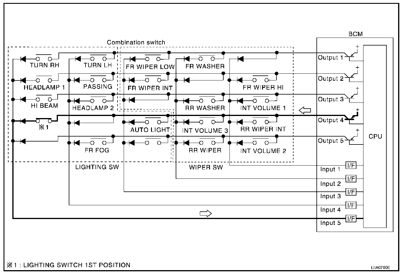 - When lighting switch 1st position is turned ON, contact in combination switch turns ON. At this time if OUTPUT 4 transistor is activated, BCM detects that voltage changes in INPUT 5.