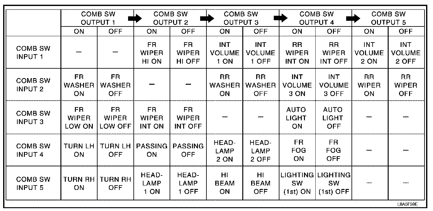 - BCM reads operation status of combination switch by the combination shown in the table.