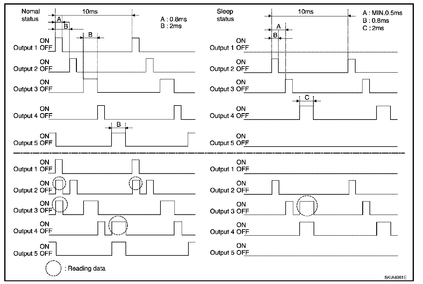 - When BCM is not in sleep status, OUTPUT terminals (1-5) each turn ON-OFF every 10 ms.
