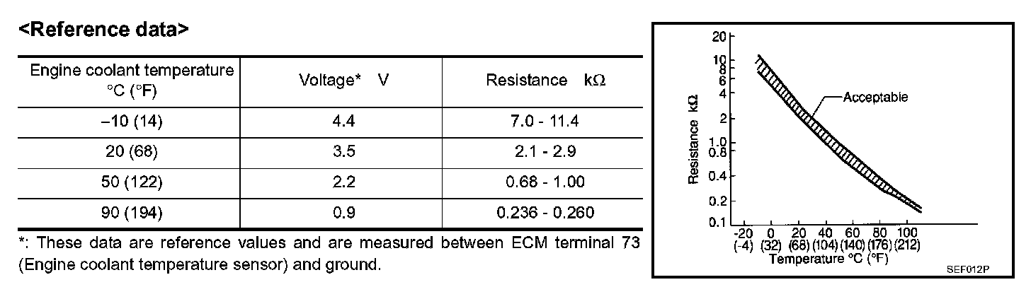 The engine coolant temperature sensor is used to detect the engine coolant temperature. The sensor modifies a voltage signal from the ECM. The modified signal returns to the ECM as the engine coolant temperature input. The sensor uses a thermistor which is sensitive to the change in temperature. The electrical resistance of the thermistor decreases as temperature increases.