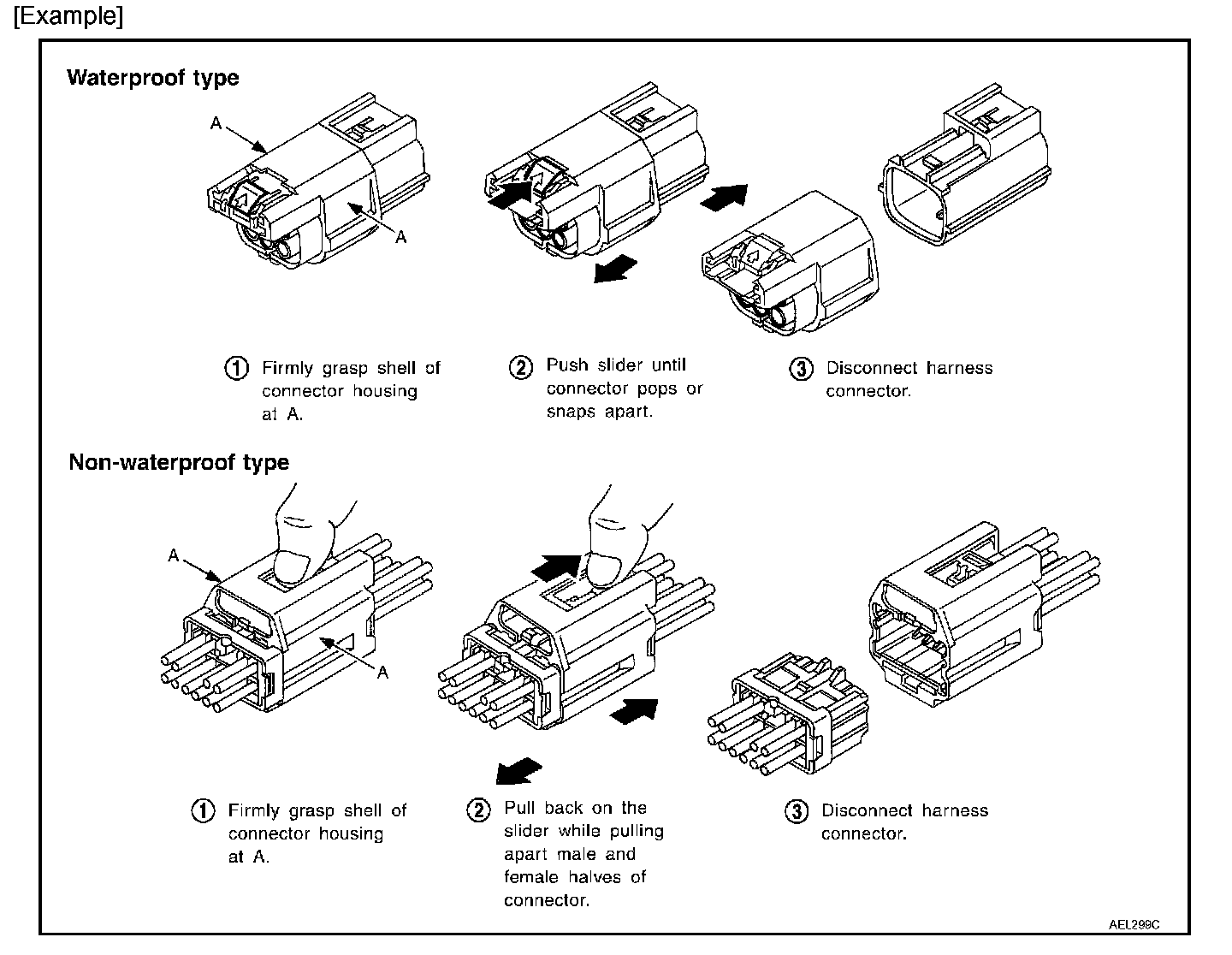 - Do not pull the harness or wires when disconnecting the connector.