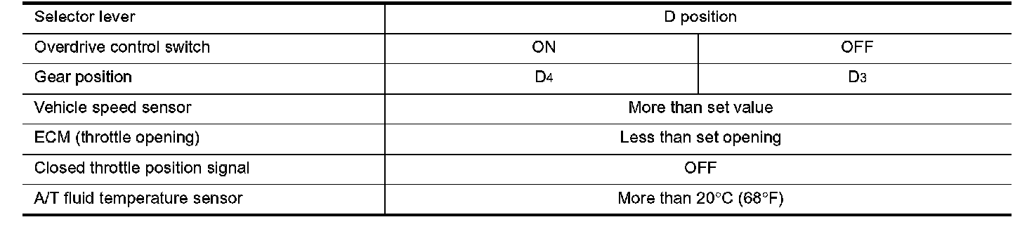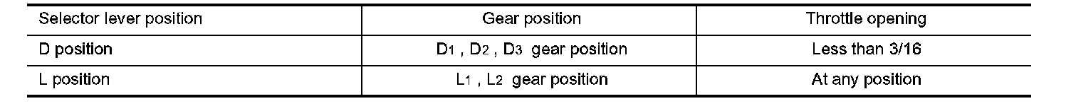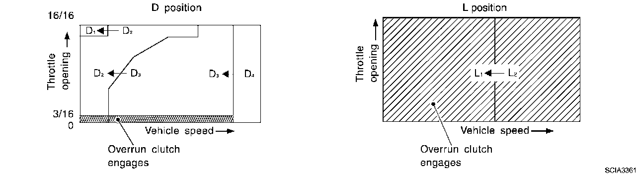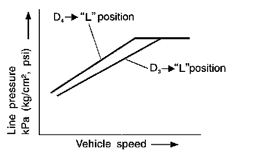 If the selector lever is shifted to L position while driving in D4 (O/D) or D3, great driving force is applied to the clutch inside the transmission. Clutch operating pressure (line pressure) must be increased to deal with this driving force.