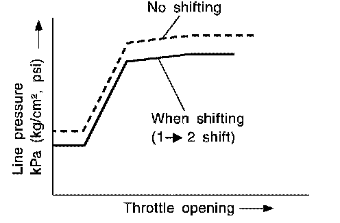 TCM has various line pressure control characteristics to meet the driving conditions. An ON-OFF duty signal is sent to the line pressure solenoid valve based on TCM characteristics. Hydraulic pressure on the clutch and brake is electronically controlled through the line pressure solenoid valve to accommodate engine torque. This results in smooth shift operation.