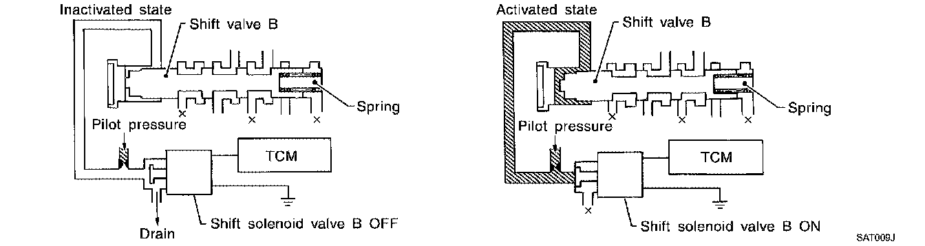 The shift solenoid valve performs simple ON-OFF operation. When set to ON, the drain circuit closes and pilot pressure is applied to the shift valve.
