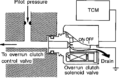 During the solenoid valve ON pilot pressure is applied to the end face of the overrun clutch control valve.