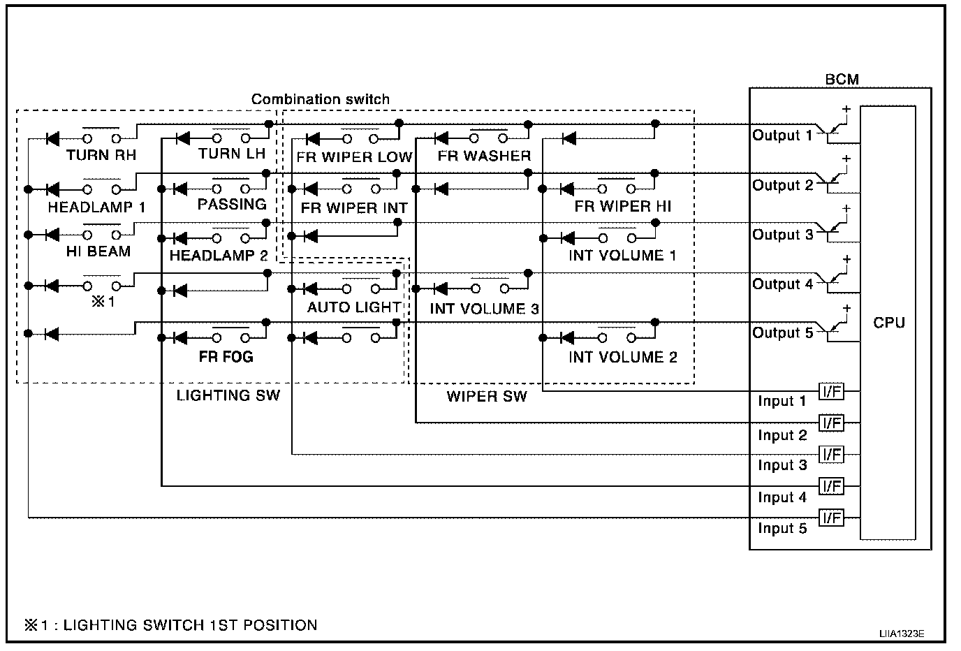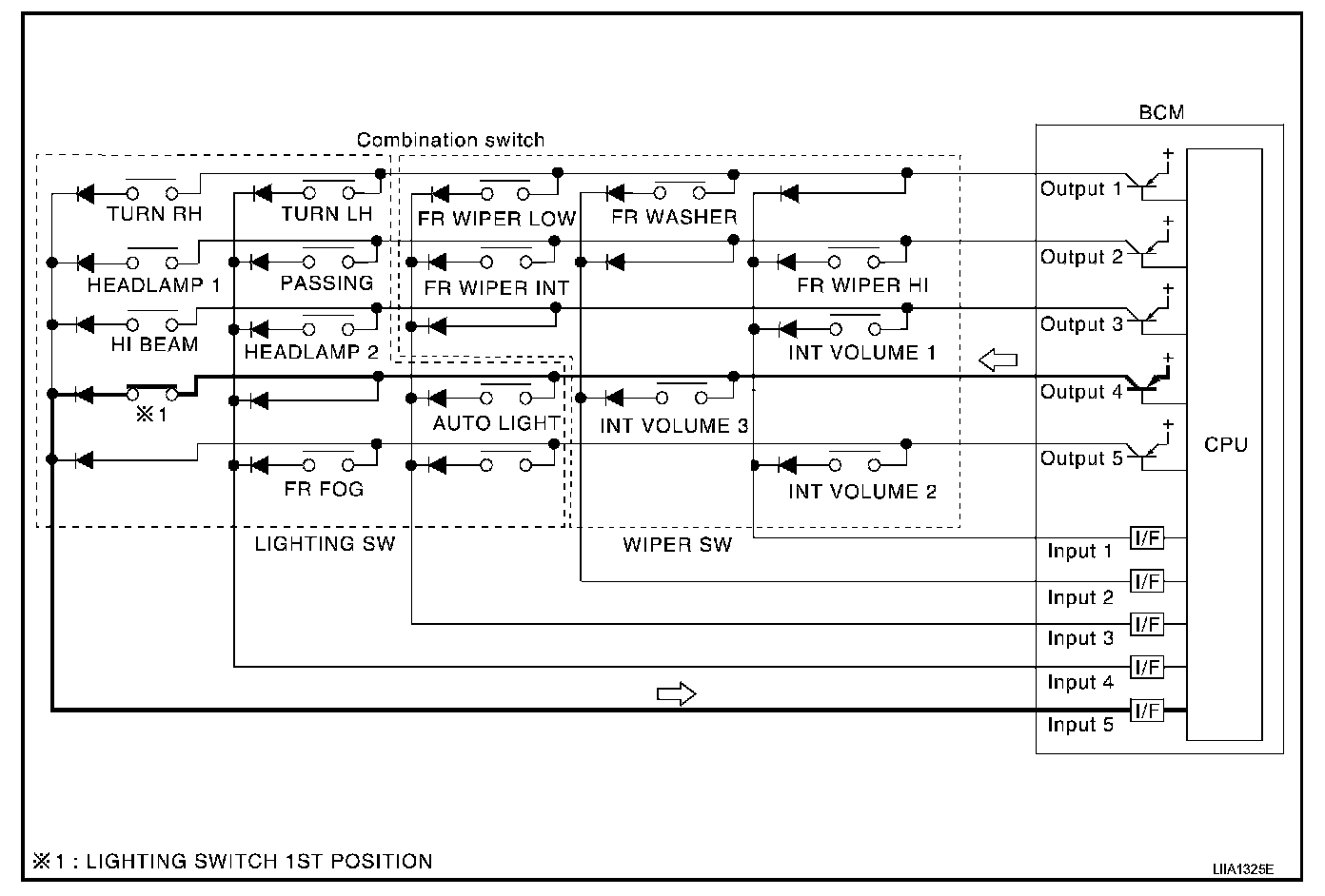- When lighting switch 1st position is turned ON, contact in combination switch turns ON. At this time if OUTPUT 4 transistor is activated, BCM detects that voltage changes in INPUT 5.