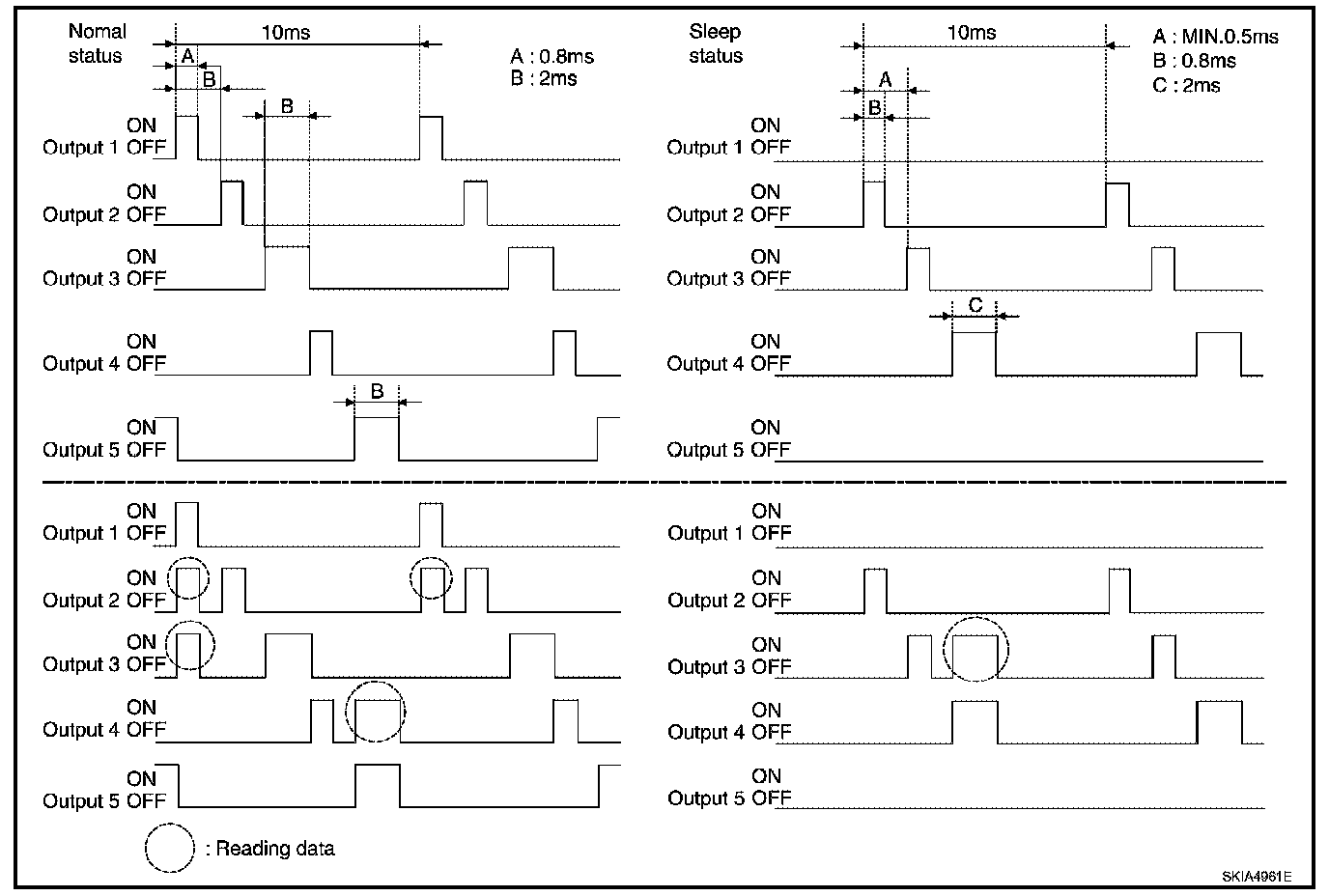 - When BCM is in sleep mode, transistors of OUTPUT 1 and 5 stop the output, and BCM enters low-current-consumption mode. OUTPUTS (2, 3, and 4) turn ON-OFF at 10 ms intervals, and receives lighting switch input only.