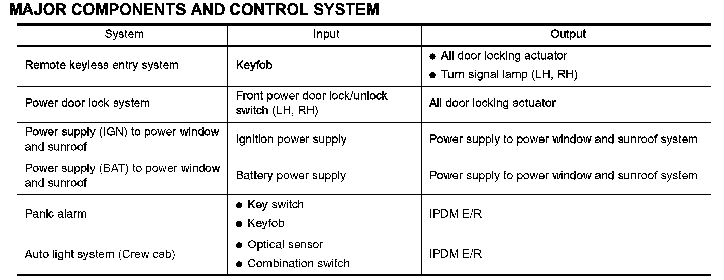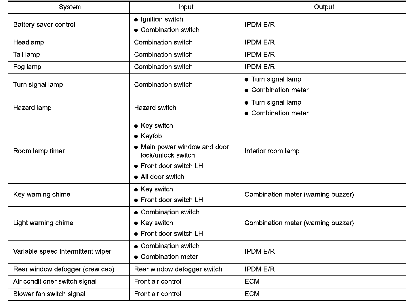 BCM has a combination switch reading function for reading the operation of combination switches (light, wiper washer, turn signal) in addition to the function for controlling the operation of various electrical components. Also, it functions as an interface that receives signals from the A/C control unit, and sends signals to ECM using CAN communication.