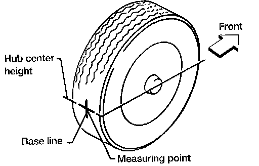 3. Put a mark on base line of the tread (rear side) of both front tires at the same height as hub center as shown. These marks are measuring points.