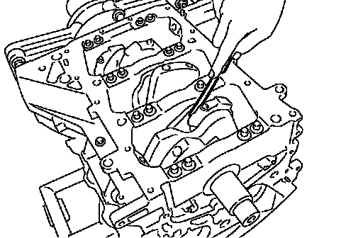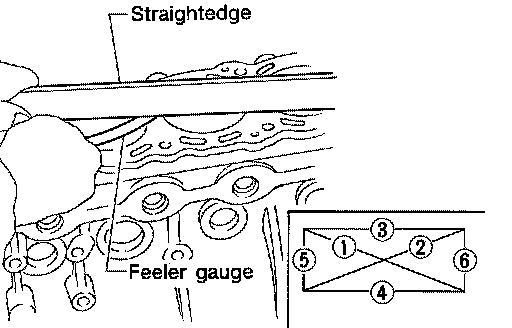 ^ Measure the distortion on the cylinder block upper face at some different points in six directions with straightedge and feeler gauge.