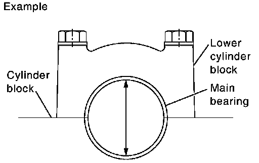 ^ Install main bearings to cylinder block and lower cylinder block, and tighten lower cylinder block bolts to the specified torque. Refer to "ASSEMBLY" for the tightening procedure. Measure the inner diameter of main bearing with bore gauge.