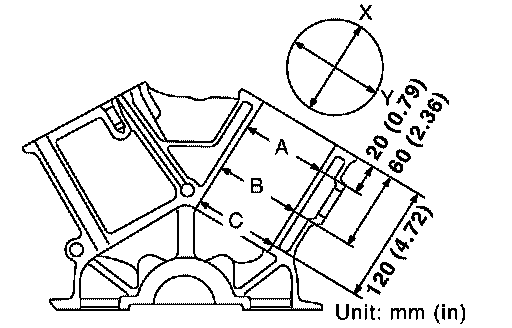 ^ Using bore gauge, measure cylinder bore for wear, out-of-round and taper at six different points on each cylinder. ("X" and "Y" directions at "A", "B" and "C") ("X" is in longitudinal direction of engine)