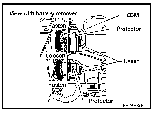- Before connecting or disconnecting the ECM harness connector, turn ignition switch OFF and disconnect negative battery cable. Failure to do so may damage the ECM because battery voltage is applied to ECM even if ignition switch is turned OFF.