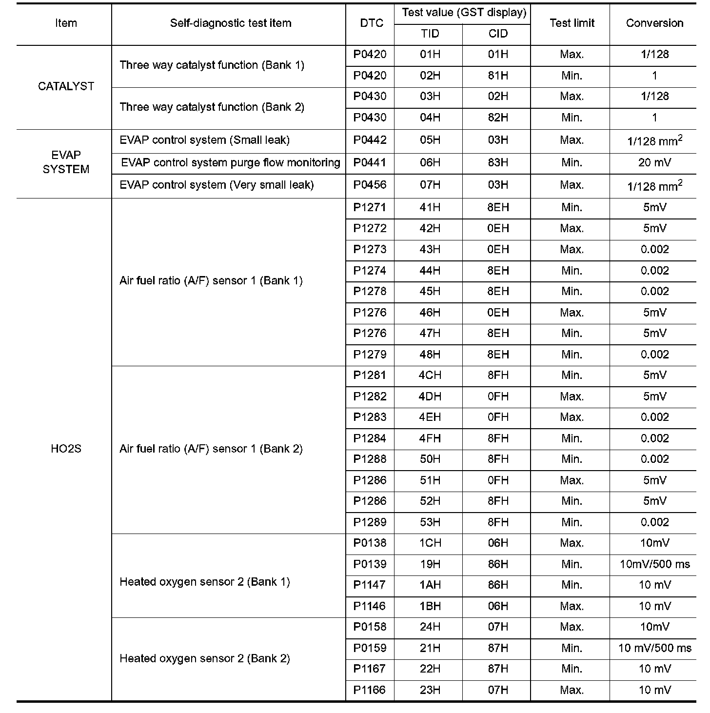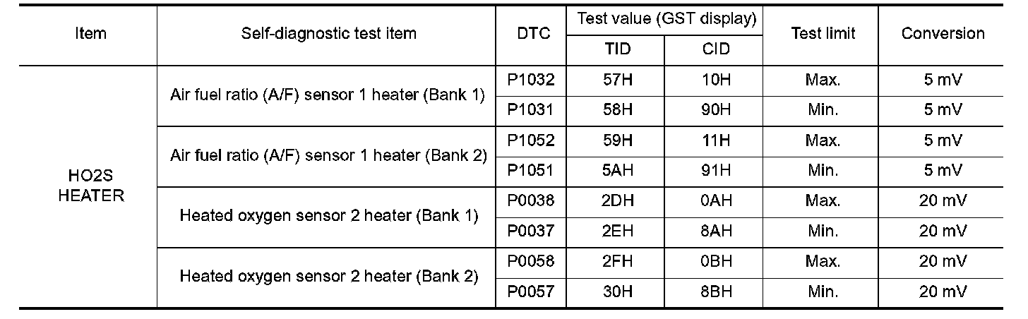 The test value is a parameter used to determine whether a system/circuit diagnostic test is OK or NG while being monitored by the ECM during self-diagnosis. The test limit is a reference value which is specified as the maximum or minimum value and is compared with the test value being monitored.