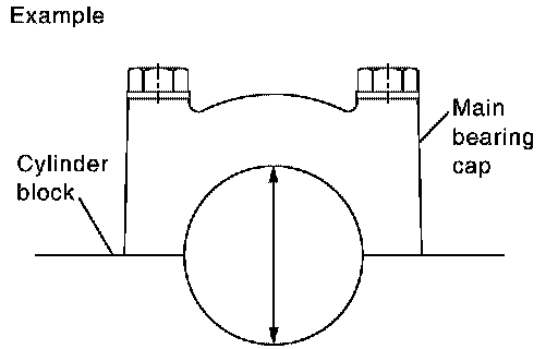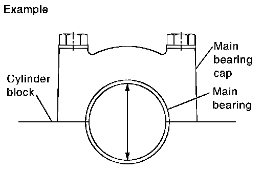 ^ Install the main bearings to the cylinder block and main bearing cap. Measure the main bearing inside diameter with the bearing cap bolt tightened to the specified torque. Refer to "ASSEMBLY".