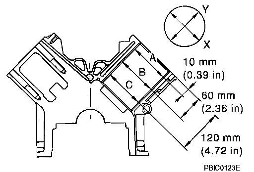 ^ Measure the cylinder bore for wear, out-of-round and taper at six different points on each cylinder ("X" and "Y" directions at "A", "B" and "C").