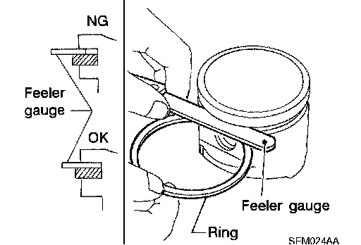 ^ If out of specification, replace piston ring. If gap still exceeds the limit even with a new ring, re-bore cylinder and use oversized piston and piston ring.