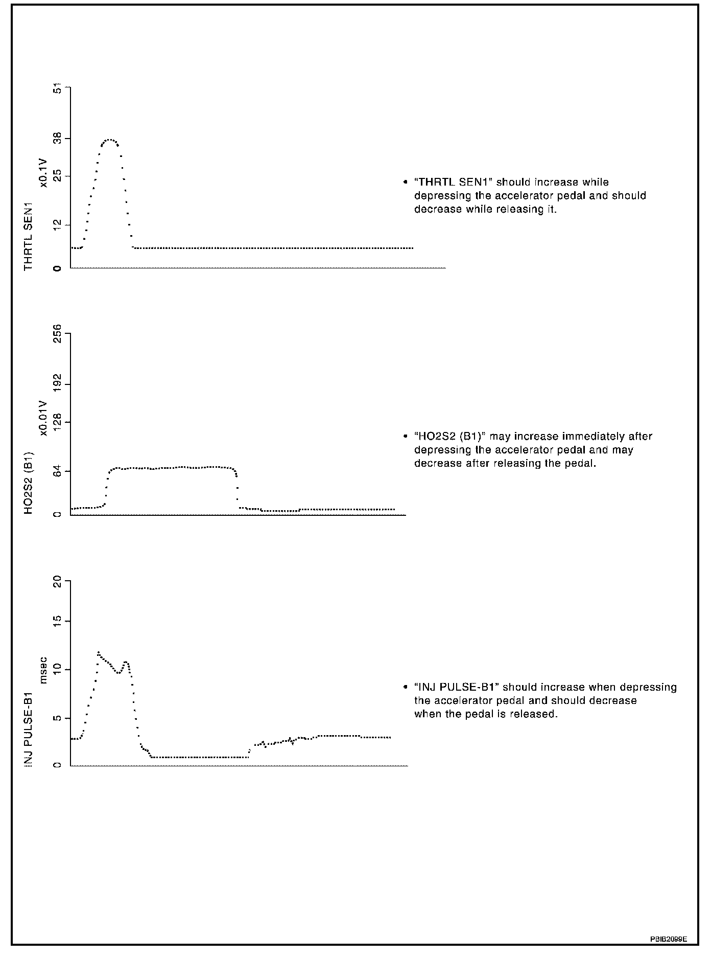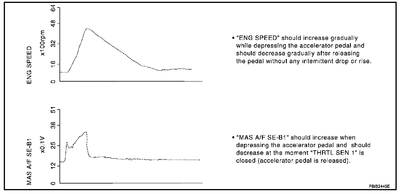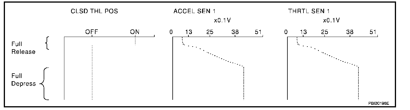 Above is the data for "CLSD THL POS", "ACCEL SEN 1" and "THRTL SEN 1" when depressing the accelerator pedal with the ignition switch ON and with selector lever in D position (A/T), 1st position (M/T).
