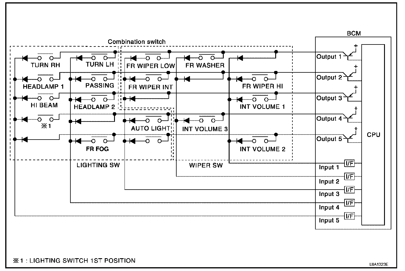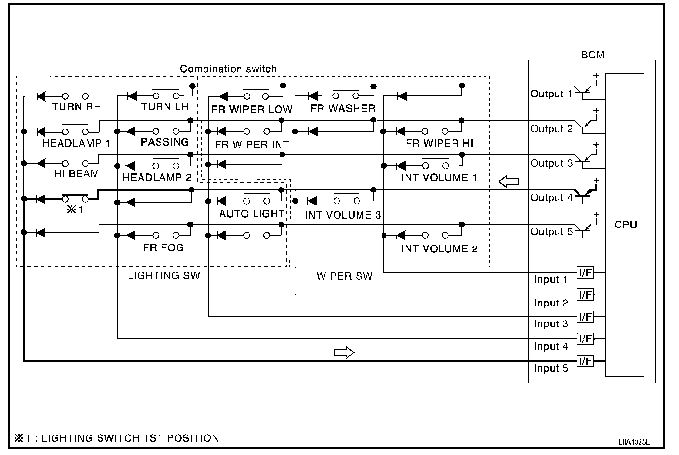 - When lighting switch 1st position is turned ON, contact in combination switch turns ON. At this time if OUTPUT 4 transistor is activated, BCM detects that voltage changes in INPUT 5.