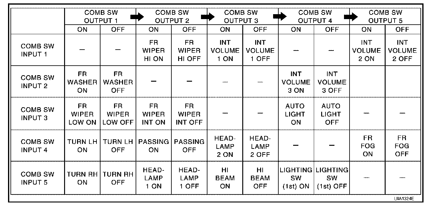 - BCM reads operation status of combination switch by the combination shown in the table.