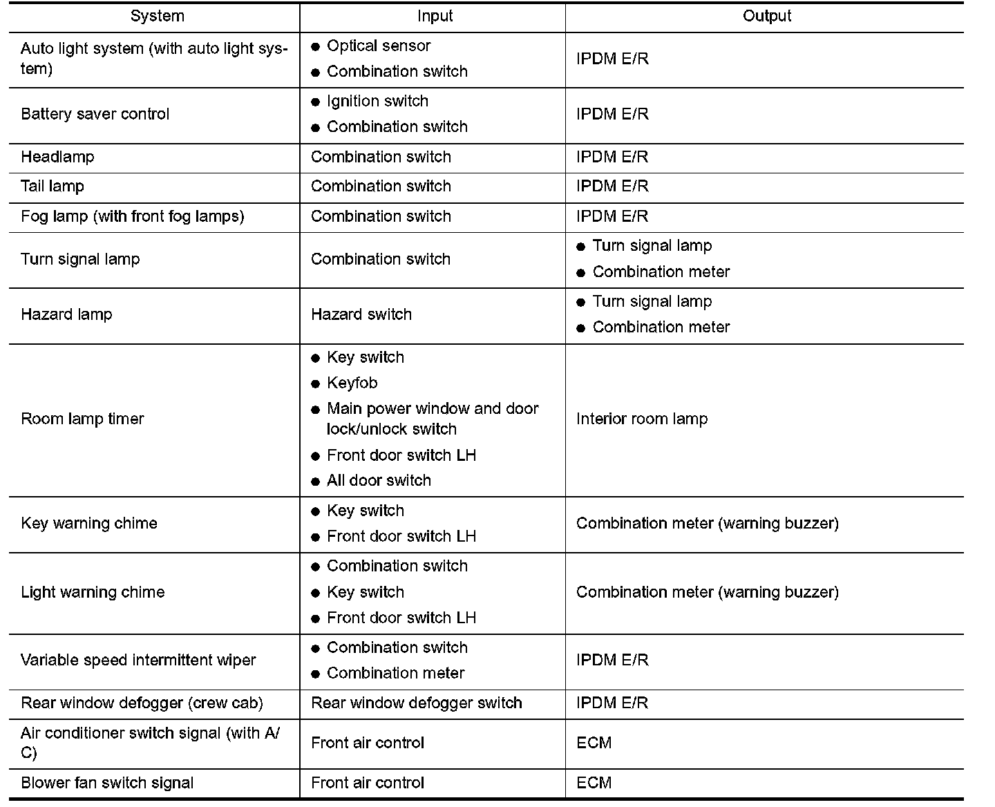 BCM has a combination switch reading function for reading the operation of combination switches (light, wiper washer, turn signal) in addition to the function for controlling the operation of various electrical components. Also, it functions as an interface that receives signals from the A/C control unit, and sends signals to ECM using CAN communication.
