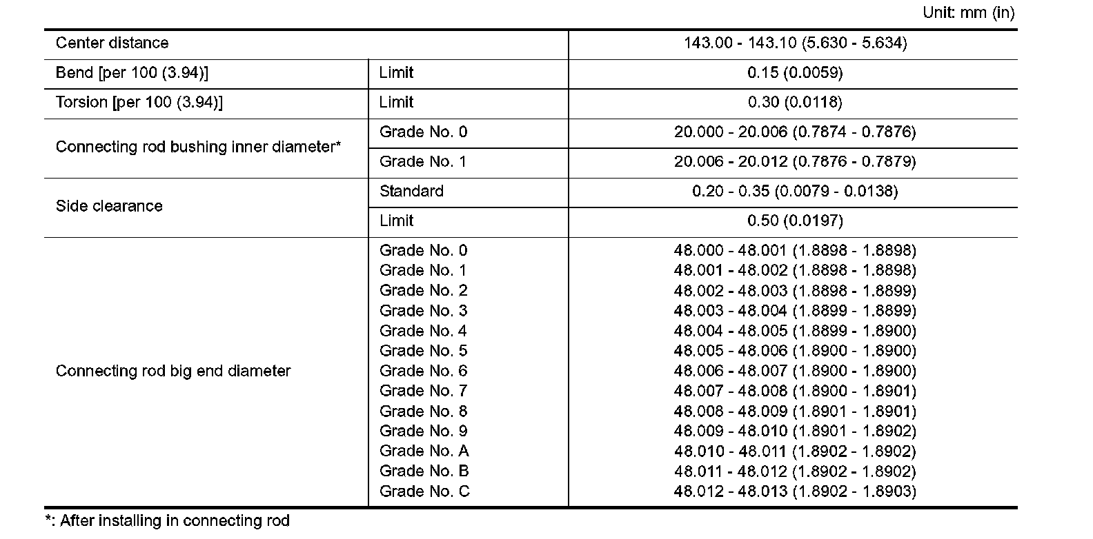 ^ If the measured value exceeds the limit, replace connecting rod, and measure again. If it still exceeds the limit, replace crankshaft also.