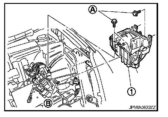 9. Remove IPDM E/R cover B mounting bolts (A) and battery cable fixed clip (B), and remove IPDM E/R cover B (1).