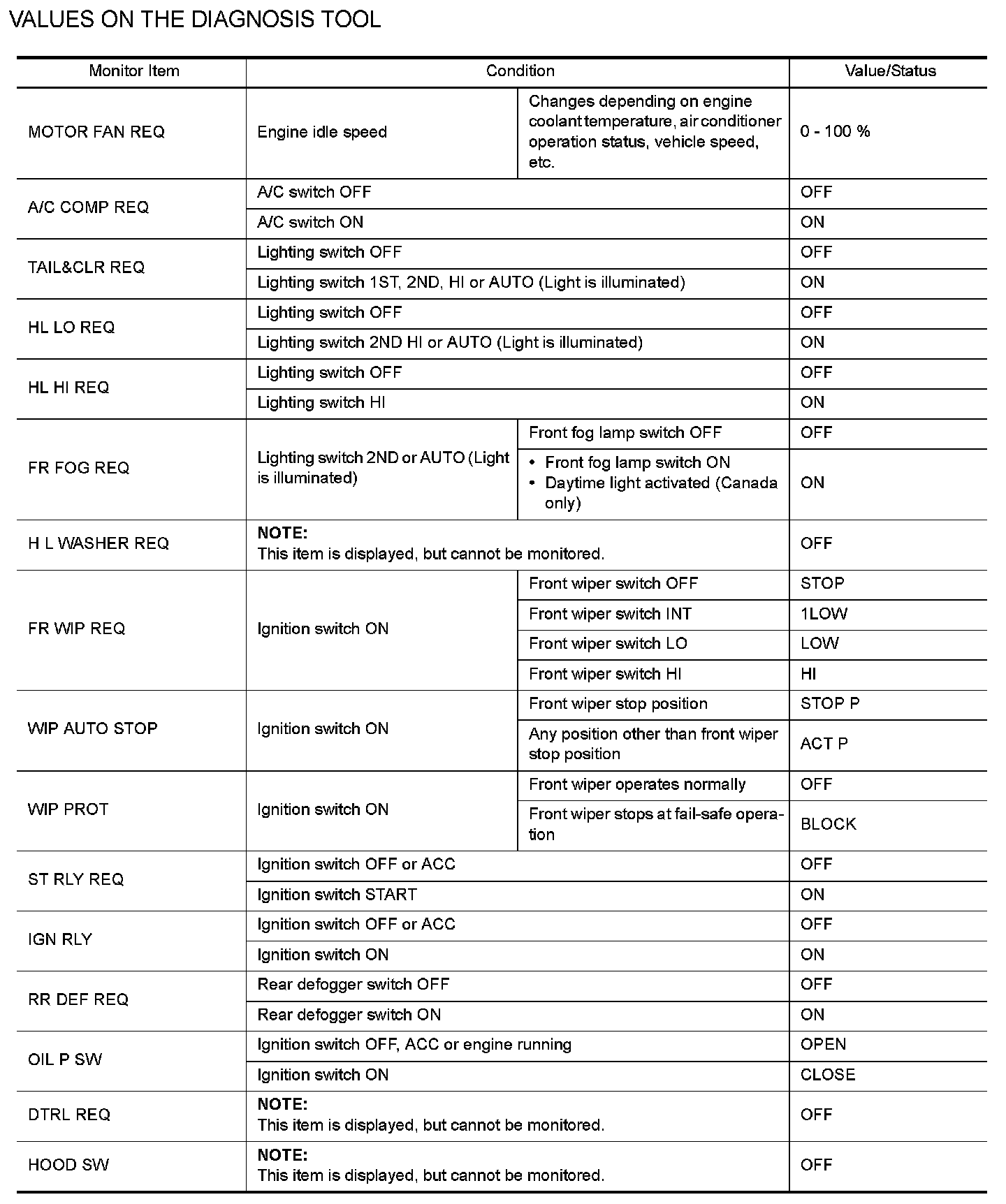 Pinout Values and Diagnostic Parameters