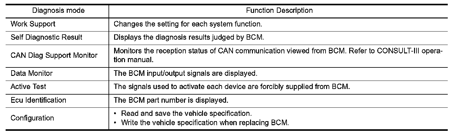 CONSULT-III performs the following functions via CAN communication with BCM.