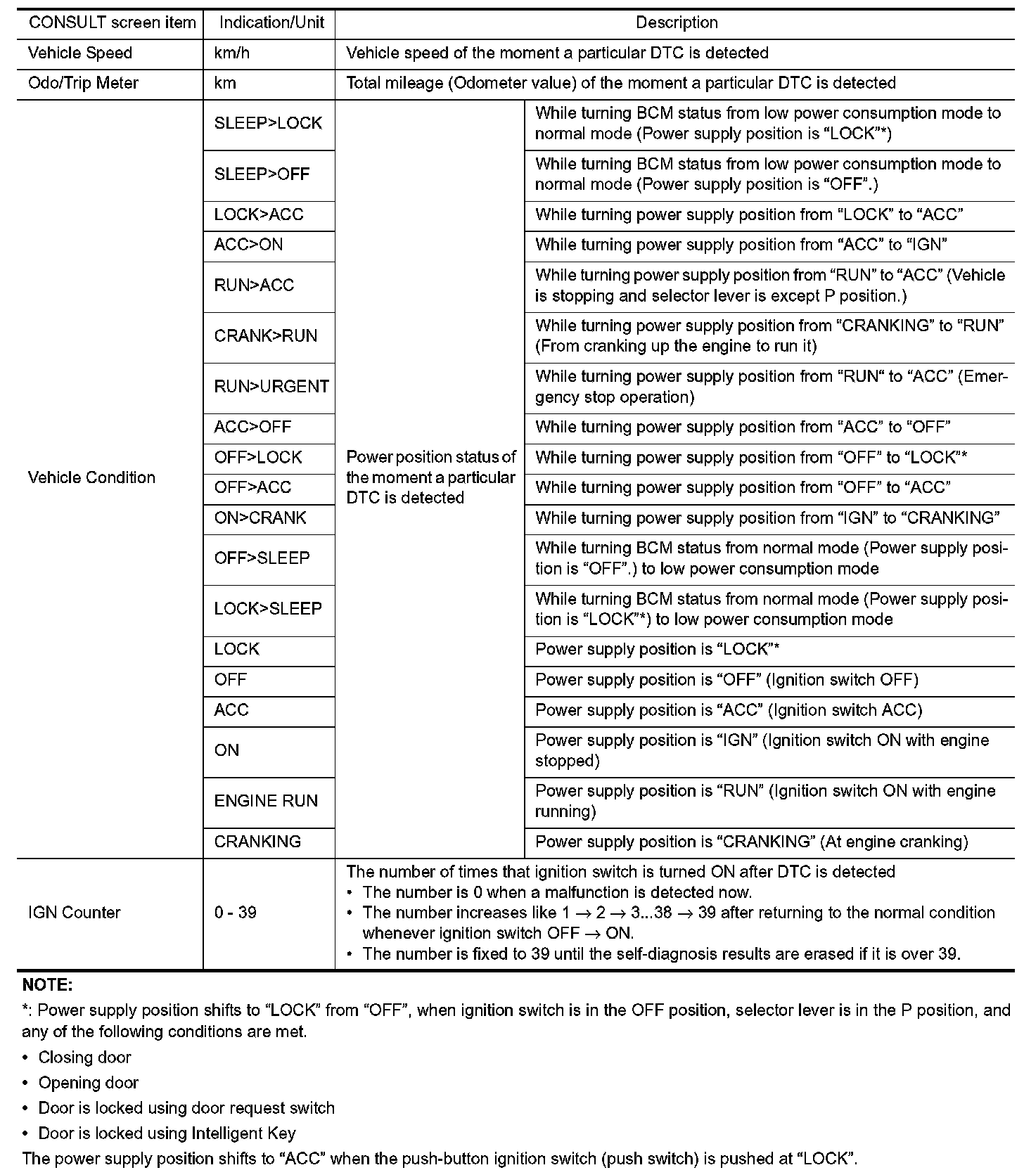 The BCM records the following vehicle condition at the time a particular DTC is detected, and displays on