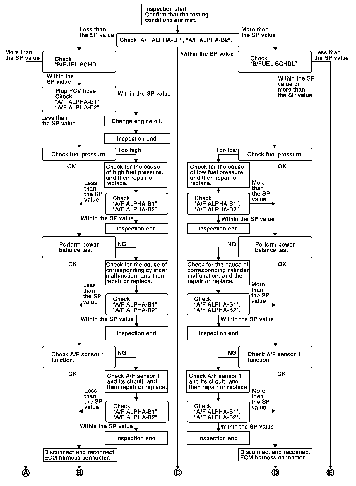 Check "A/F ALPHA-B1", "A/F ALPHA-B2" for approximately 1 minute because they may fluctuate. It is NG if the indication is out of the SP value even a little.