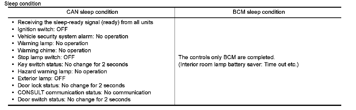 - BCM transmits the sleep wake up signal (sleep) to each unit when all of the CAN sleep conditions are fulfilled.