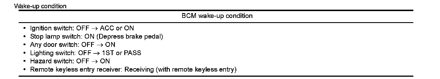 - BCM transmits sleep wake up signal (wake up) to each unit when any condition listed below is established, and then goes into normal mode from low power consumption mode.